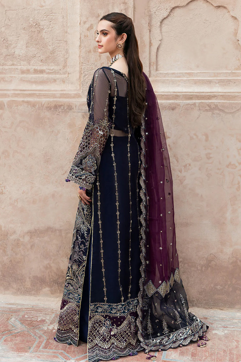 An elegant deep blue-toned long front open gown adorned with intricate Resham and sequin work. Paired with straight trousers and a delicately embroidered organza dupatta, this timeless ensemble is perfect for weddings and festive occasions.