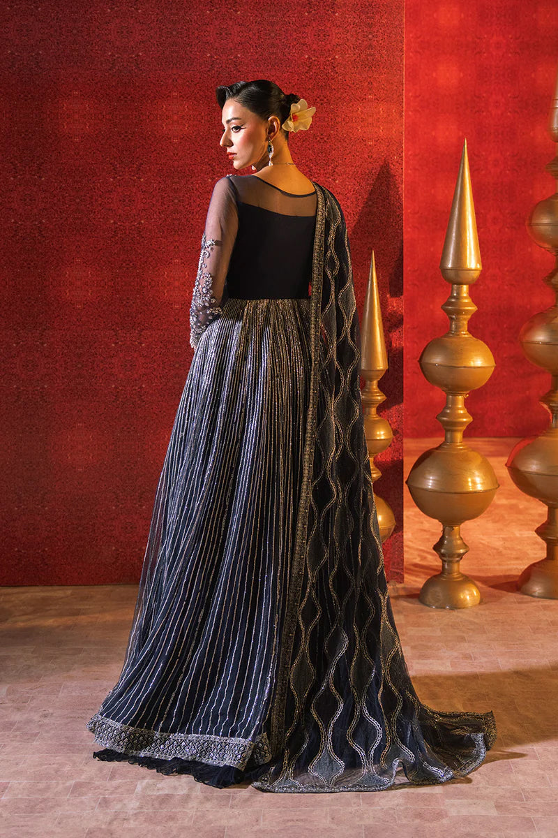 Step into refined elegance with this mesmerizing 3-Piece Pret in a timeless Navy Blue hue. Crafted from a graceful blend of Bareeze net and chiffon, the shirt features a fully embroidered and embellished front panel with a heavily adorned bodice for a striking, regal appeal. The straight fitted sleeves are finished with delicate tassel details at the openings, adding subtle charm. Paired with a flowing chiffon lehenga and a soft net dupatta, this ensemble is the epitome of sophistication and evening glamour.